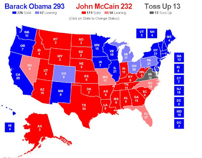 AGGIORNAMENTO: mi sono messo curiosità da solo. Ho svolto delle simulazioni. Per spuntarla, con la situazione attuale McCain dovrebbe portarsi vicino ad Obama nel voto popolare; almeno a -0,5% per sperare di farcela al fotofinish. Se vince il voto popolare è quasi sicuro che superi i 270 grandi elettori.