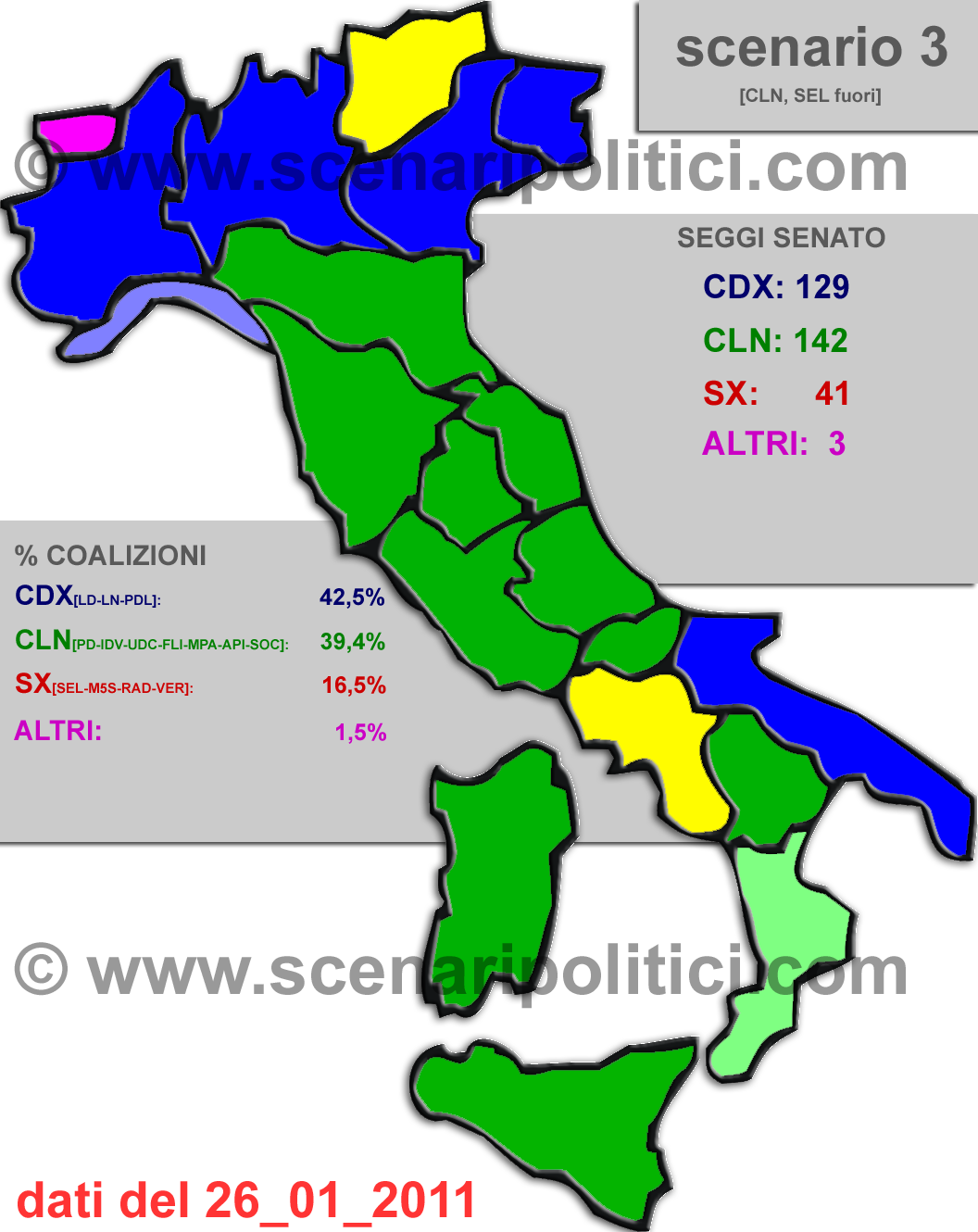 Vediamo cosa succede nelle regioni Toss-Up, escluderemo al solito dalla contesa il Trentino Alto Adige che elegge con l’uninominale. Rimane solamente la Campania, qui assegnata, per un punto, al CLN. Qualora prevalesse il CDX avremmo una situazione di sostanziale parità con 134 seggi per il CSX e 137 per il CDX. In qualunque modo la si giri è palese che ci si troverebbe in una situazione instabile, con una SX molto forte, un CDX maggioranza assoluta alla Camera ed un CLN variegato con numeri insufficienti sia a Montecitorio che a Palazzo Madama. Possibile un governo di unità nazionale.