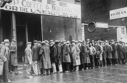 La Grande Depressione. Disoccupati in coda per qualcosa da mangiare e bere.