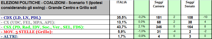 Ci avviciniamo alla fine dei dati GPG del mese di Marzo. Oggi pubblichiamo il resoconto del primo scenario, che potremmo definire come lo scenario classico con CDX, Centro, CSX e M5S in corsa solitaria.