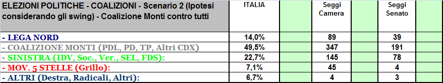 In parlamento la Coalizione Monti avrà un’ampia maggioranza sia alla Camera che al Senato dove comunque LN e SX saranno ben rappresentate.