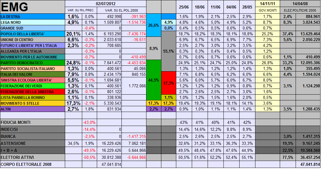 Questa sera Mentana, durante il Tg di La7 ha divulgato un nuovo sondaggio EMG.