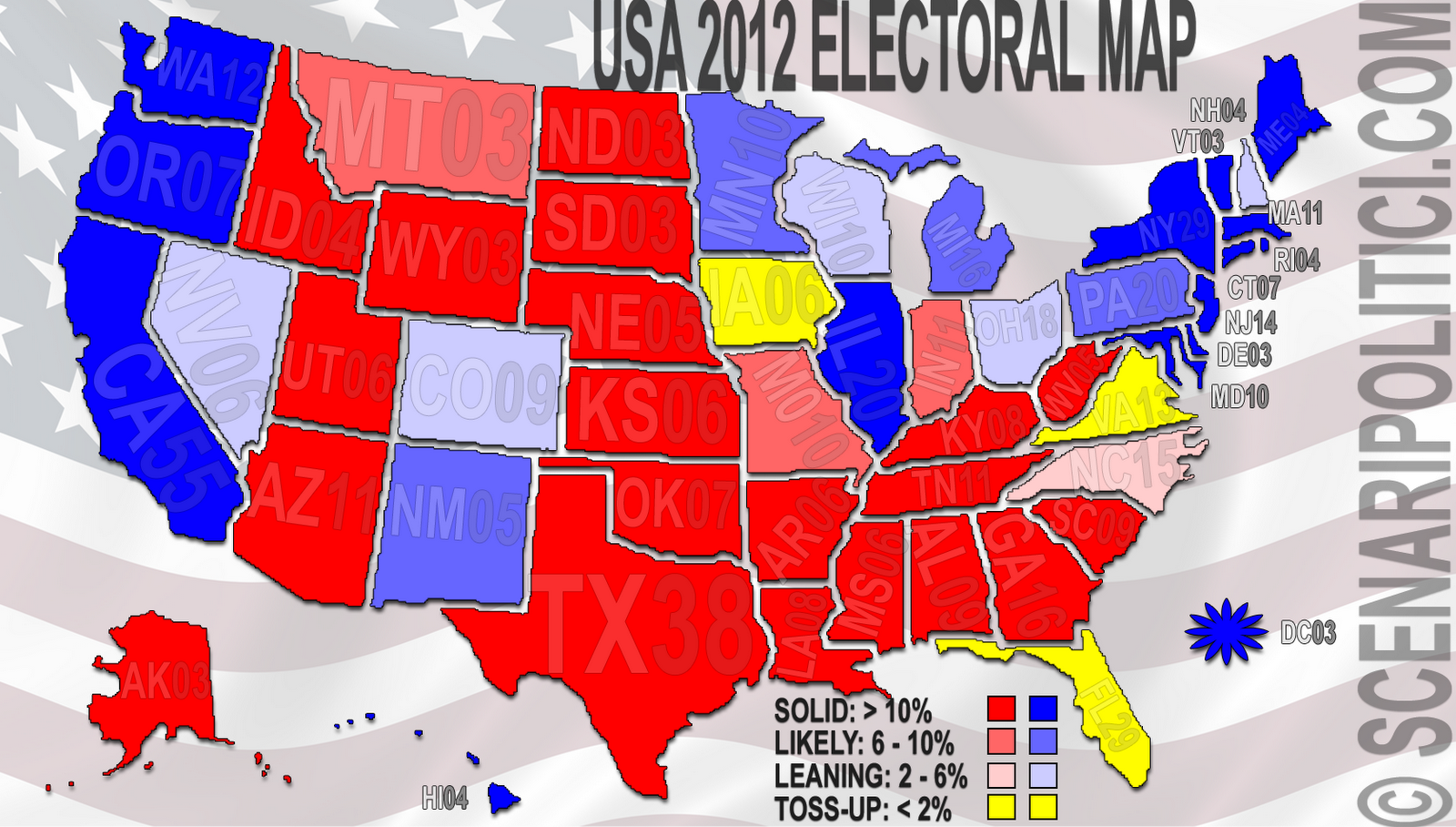 Nei singoli stati non cambia poi molto, aumenta il distacco in Missouri, ormai nei Likely per Romney, anche in NC il candidato GOP aumenta il vantaggio.