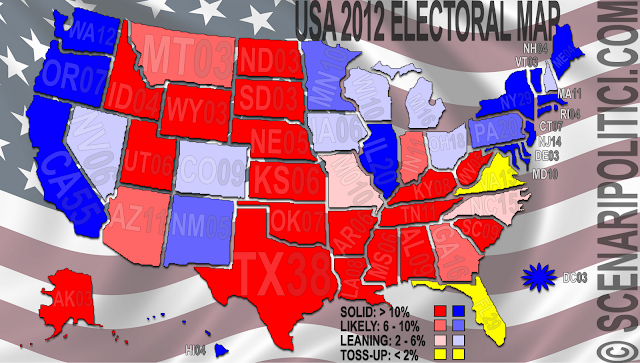Inoltre, onde evitare il balletto degli stati che oggi sono toss-up, domani leaning e dopodomani di nuovo toss-up, optiamo per un margine ulteriore di mezzo punto, ciò significa che uno stato, per esempio l’Ohio che ora è dato con Obama a +2,1%, per diventare toss-up deve scendere almeno a +1,5%. Di contro, uno stato toss-up, prima di diventare leaning deve raggiungere uno scarto tra i due contendenti di almeno 2,5 punti.