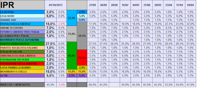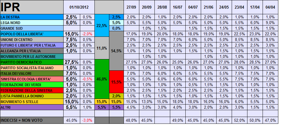 Sondaggio IPR: PD 27,5% PDL 15% M5S 15% 13 anni ago Elezioni Sondaggio IPR per il Tg3. Terzo sondaggio in 10 giorni. Crolla il PDL, passando in 4 giorni dal 17 al 15%, 10 giorni fa era addirittura al 19%.In lieve cresita anhe LD, UDC e Radicali. Perde mezzo punto SEL.Il PDL è raggiunto, di nuovo, dal M5S. Share Tweet Share Share