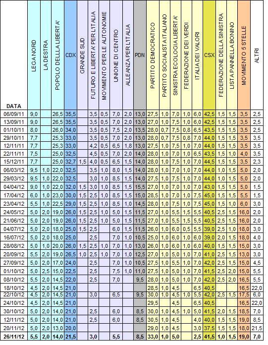 Tornano a censire senza la Lista Monti. Attenzione però che c’è un 3% di Altri di CSX negli “Altri”. Spero che facciano al più presto chiarezza sulle coalizioni, soprattutto nel CSX.