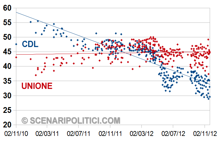 L’Unione invece, partendo intorno al 40% è riuscita a risalire fino al 45-50% per poi ritornare, a causa del boom del M5S intorno al 45%. Ad oggi i sondaggi sulle dimensioni della vecchia Unione sono un po’ discordanti e vanno da sotto il 40% fin quasi al 50%.