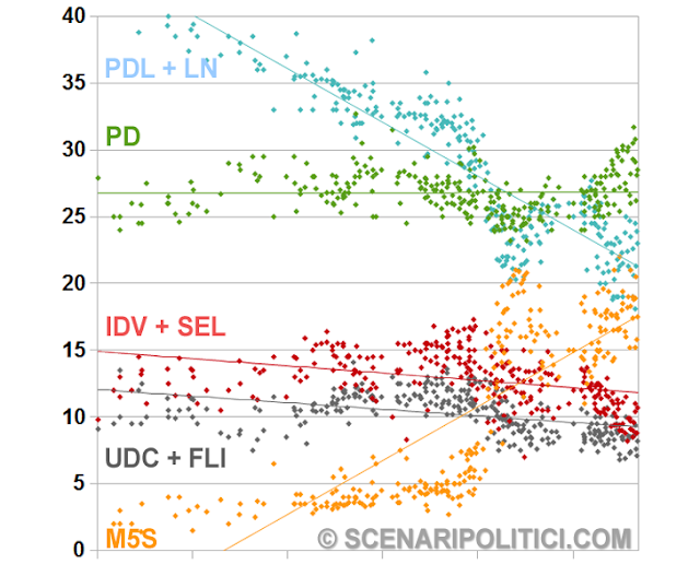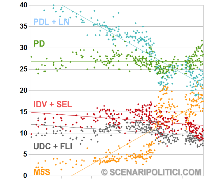 In questo semplice grafico alleghiamo tutti i sondaggi del 2011 e 2012 divisi tra PDL-LN, PD, IDV-SEL, UDC-FLI, M5S.