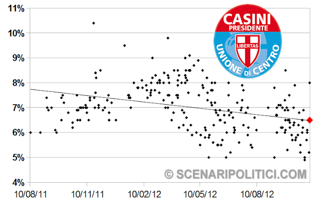 Lega Nord: il forte  calo del primo semestre 2012 sta penalizzando forse oltremodo la LN. Gli ultimi sondaggi sono mediamente sopra la linea di regressione.
