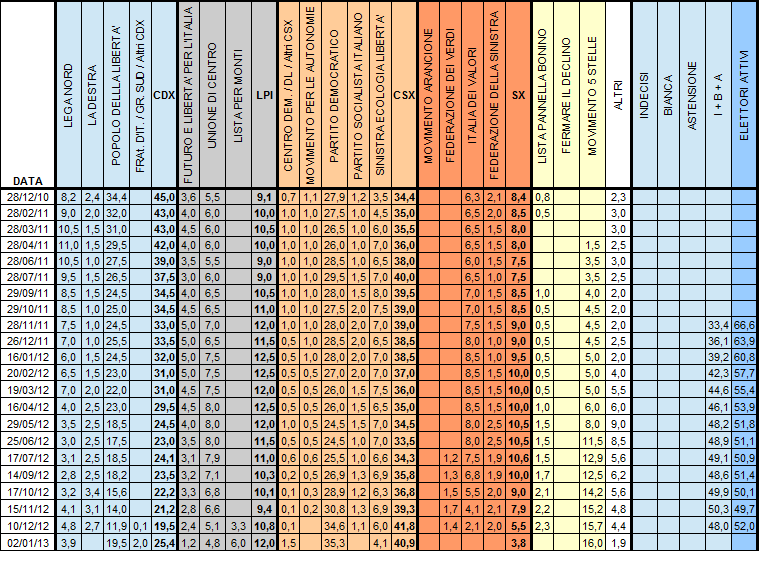 Rivoluzione Civile (il blocco di SX) è pericolosamente sotto il 4%.