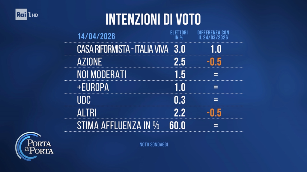 Durante la puntata del 14 aprile 2026 di Porta a Porta (Rai 1) è stata pubblicata una nuova indagine sulle intenzioni di voto nazionali prodotta da Noto Sondaggi.