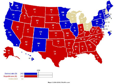 AGGIORNAMENTO: in estrema analisi con un grande azzardo si può dire che il Wisconsin sarà DEM ed il Michigan GOP. Questo porta al discorso del 2004, chi vince l’Ohio vince le elezioni. Per ora però la mappa rimane così. Va anche detto che sto monitorando la Virginia, qualcosa bolle in pentola ci sono sondaggi allarmanti che danno Obama avanti, potrebbe precipitare presto nei toss-up cambiando tutto