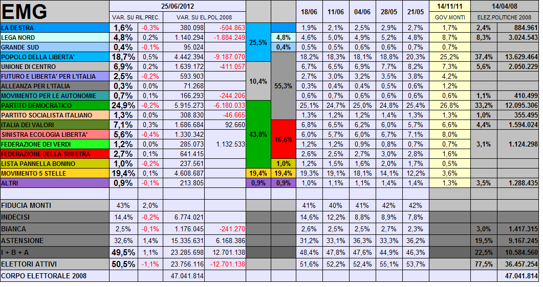 Lunedì sera Mentana, durante il Tg di La7 ha divulgato un nuovo sondaggio EMG.