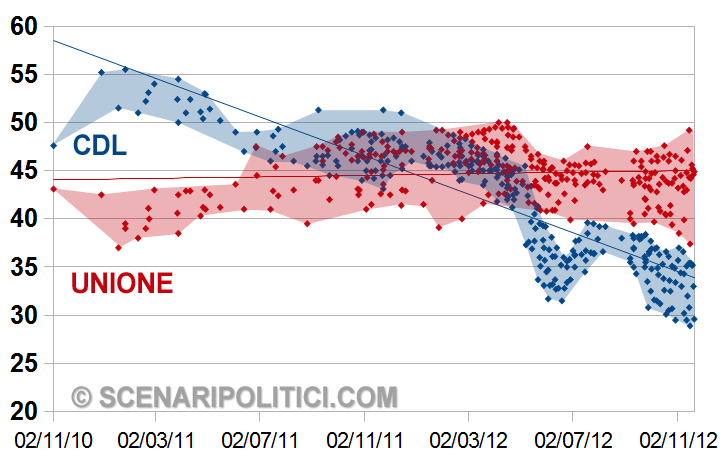 L’Unione invece, partendo intorno al 40% è riuscita a risalire fino al 45-50% per poi ritornare, a causa del boom del M5S intorno al 45%. Ad oggi i sondaggi sulle dimensioni della vecchia Unione sono un po’ discordanti e vanno da sotto il 40% fin quasi al 50%.