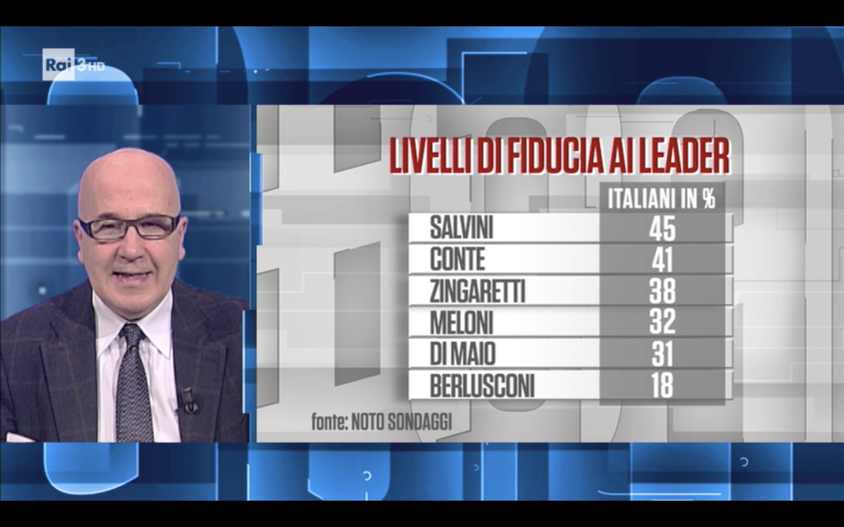 Con il 48%, Matteo Salvini rimane in testa nel gradimento dei leader, anche se in calo rispetto ai mesi scorsi, come fa notare Antonio Noto. Molto più staccato invece Luigi Di Maio, con il 31%. Esordisce al 38% Nicola Zingaretti, neo-segretario PD.