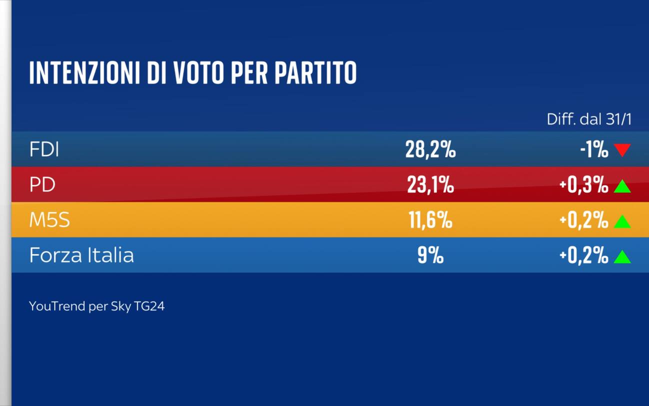 Sky TG24 ha presentato il 10 marzo 2025 un nuovo sondaggio realizzato da YouTrend sulle intenzioni di voto.